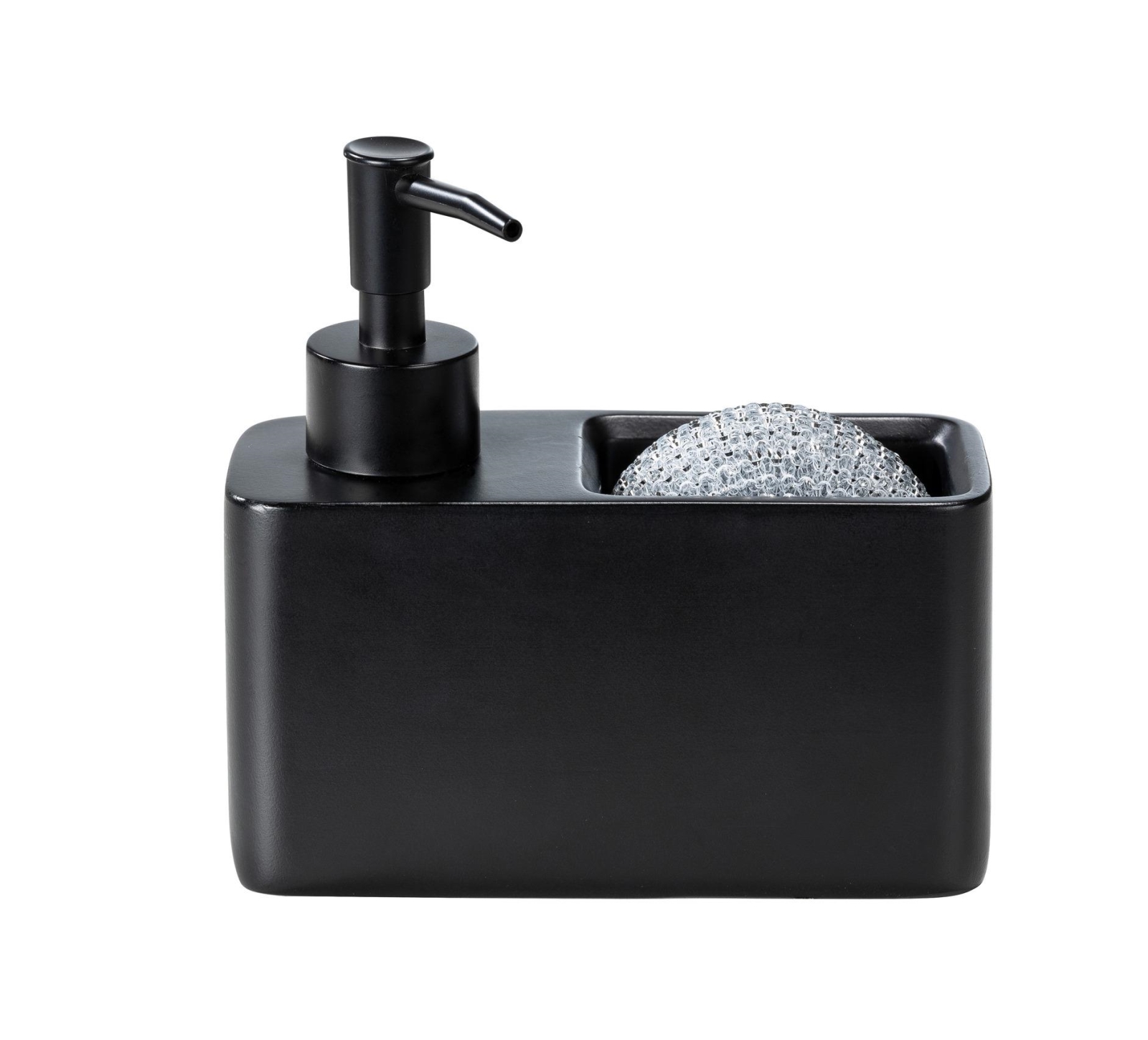 • Elegante dosificador de jabón y detergente con un moderno diseño en negro.