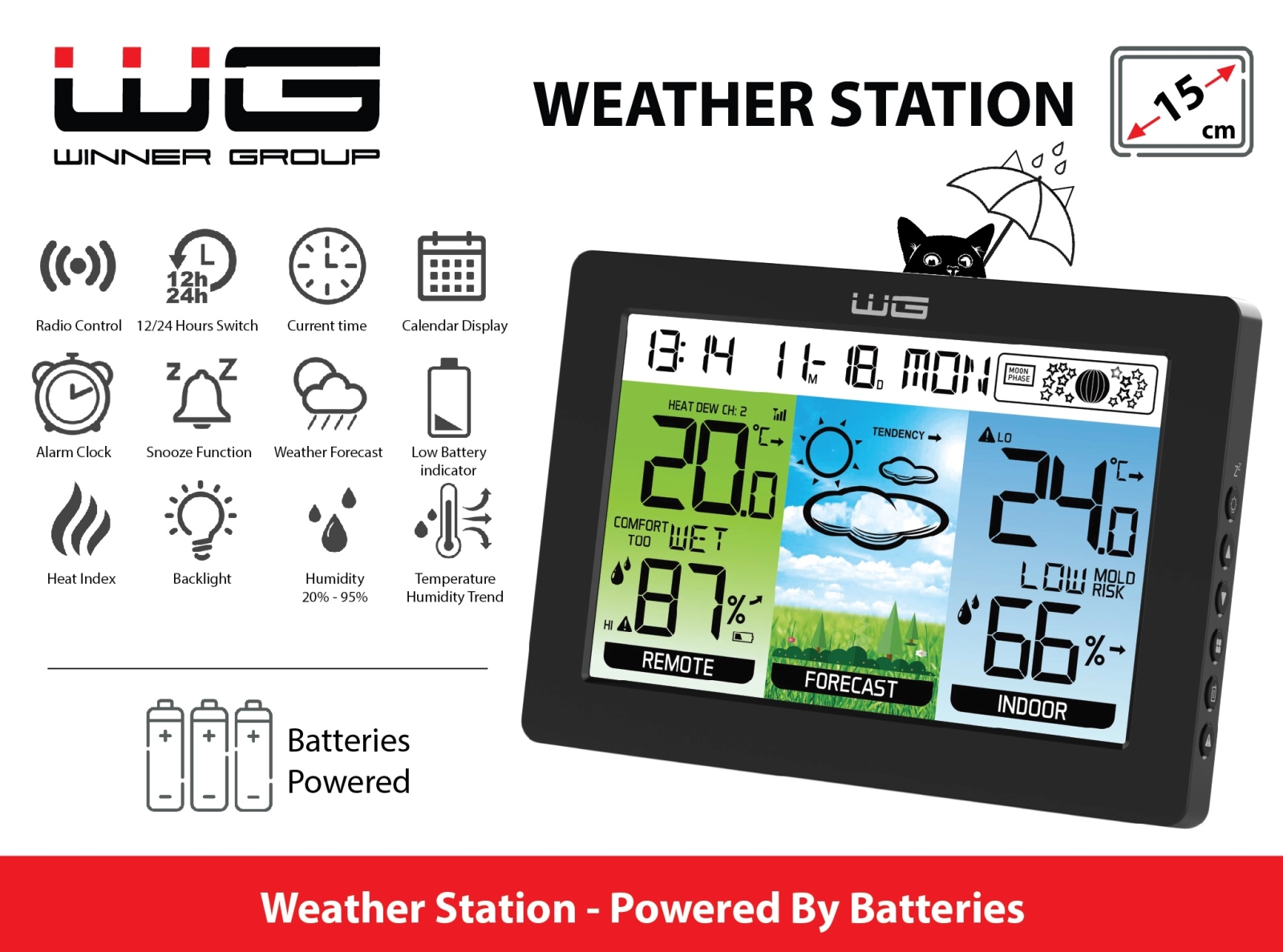 Winner Group - Estación meteorológica con pantalla LCD y reloj despertador, 5x AAA