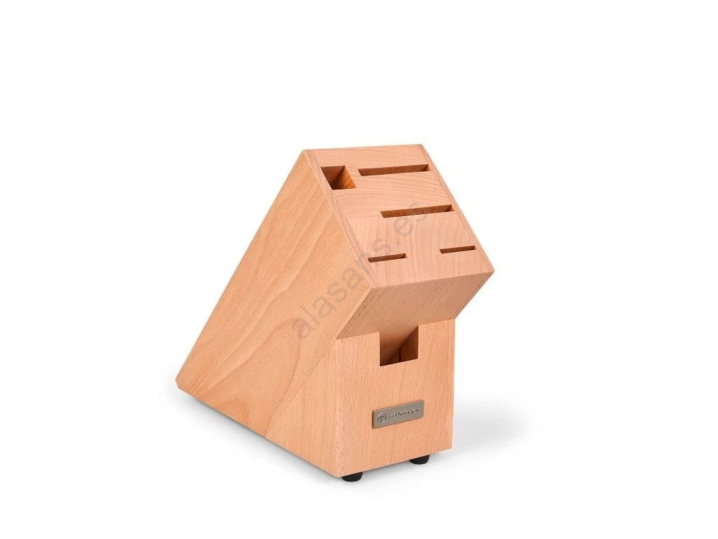 • El bloque para cuchillos está fabricado en madera de haya y ofrece espacio para alojar hasta 4 cuchillos, un fusil de afilar y unas tijeras de cocina.