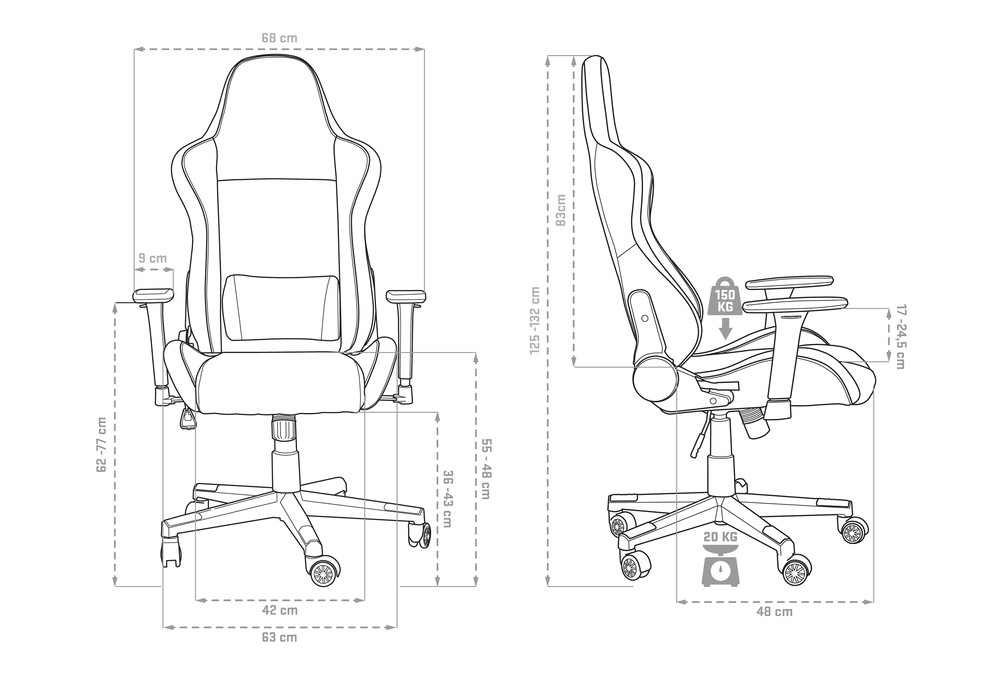 • La base completa, que incluye un marco de acero, ruedas y un dispositivo de elevación de gas de clase 4 de seguridad, está diseñada para una carga máxima de hasta 150 kg.