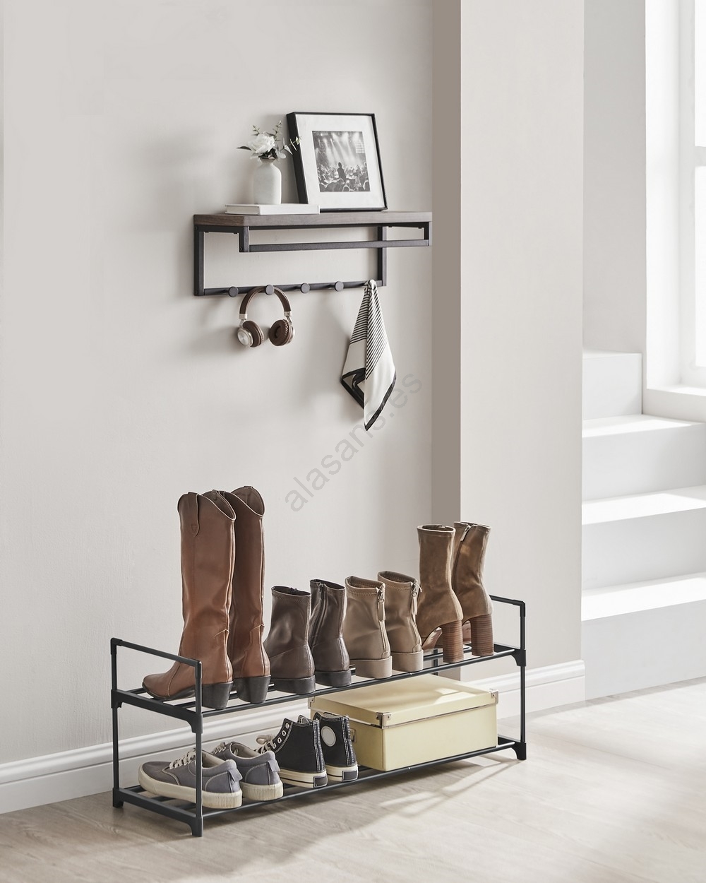• Gracias a su silueta esbelta, este zapatero de 2 niveles ocupa poco espacio en el suelo y, aun así, ofrece suficiente espacio de almacenamiento; puede alojar hasta 8 pares de calzado masculino o 10 pares de mujer.